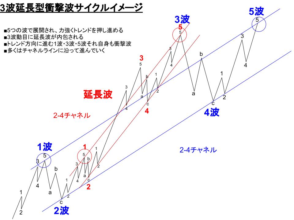推進波である衝撃波は5つ波でトレンド方向に相場を力強く押し進めていきますが、そのほとんどはトレンド方向に進む副次波1波動目、3波動目、5波動目のいずれかがエクステンションしてくるという大きな特徴があります。